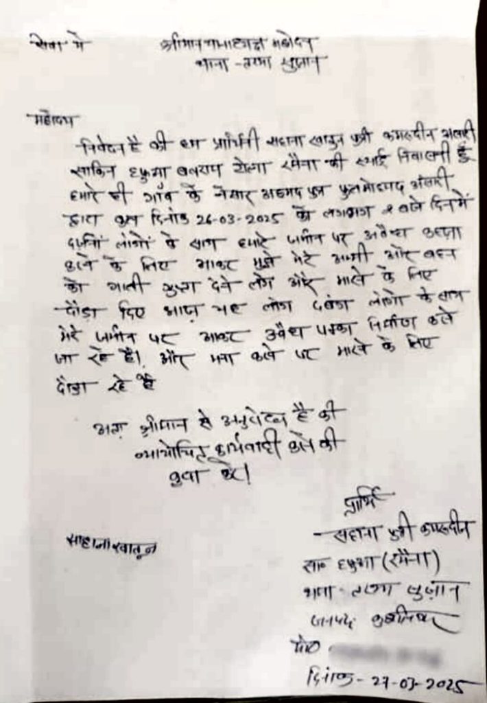 लेकिन वहीं कुशीनगर जनपद के तमकुहीराज तहसील के तरयासुजान थाना क्षेत्र अंतर्गत ग्राम हफुआ बलराम रमैना टोला में एक दबंग दरोगा नेसार अहमद पुत्र फूल मोहम्मद द्वारा अपने पड़ोसी (पट्टीदार )शहाना खातून पुत्री कमरुद्दीन अंसारी के जमीन और नवीनपरति के भूमि पर अवैध रूप से जबरन पक्का निर्माण कराया जा रहा है। उल्लेखनीय है कि उक्त नेसार अहमद नामक व्यक्ति अरूणांचल प्रदेश में दरोगा के पद पर तैनात है और अपने रसूख के बल पर घर आ कर दरोगा होने का नजायज लाभ लेने के लिए गोलबंद होकर पीड़ित महिला के ज़मीन पर अवैध कब्जा कर रहा है। पीड़ित महिला ने बताया कि बीते कल 26 तारीख को गोलबंद होकर उक्त व्यक्ति मेरे दरवाजे पर चढ़ कर मेरी अम्मी सहित मेरी बहनों को भद्दी भद्दी गालियां देने लगा और मारने के लिए दौड़ा दिया। पीड़ित महिला द्वारा स्थानीय पुलिस चौकी बहादुरपुर को शिकायत पत्र देने पर पुलिस ने पहुंच कर काम रुकवा दिया लेकिन आज पुलिस के लौटने पर पुनः उक्त दबंग व्यक्ति द्वारा काम शुरू करवा दिया गया है। प्रतिरोध करने पर दबंग मार पीट और गाली गलौज पर उतारू है।