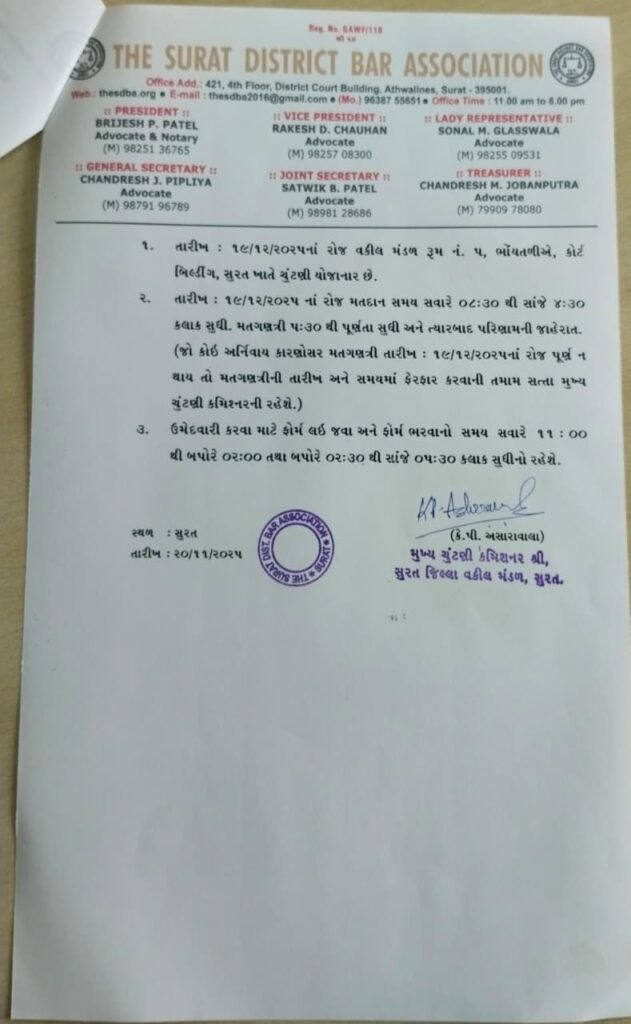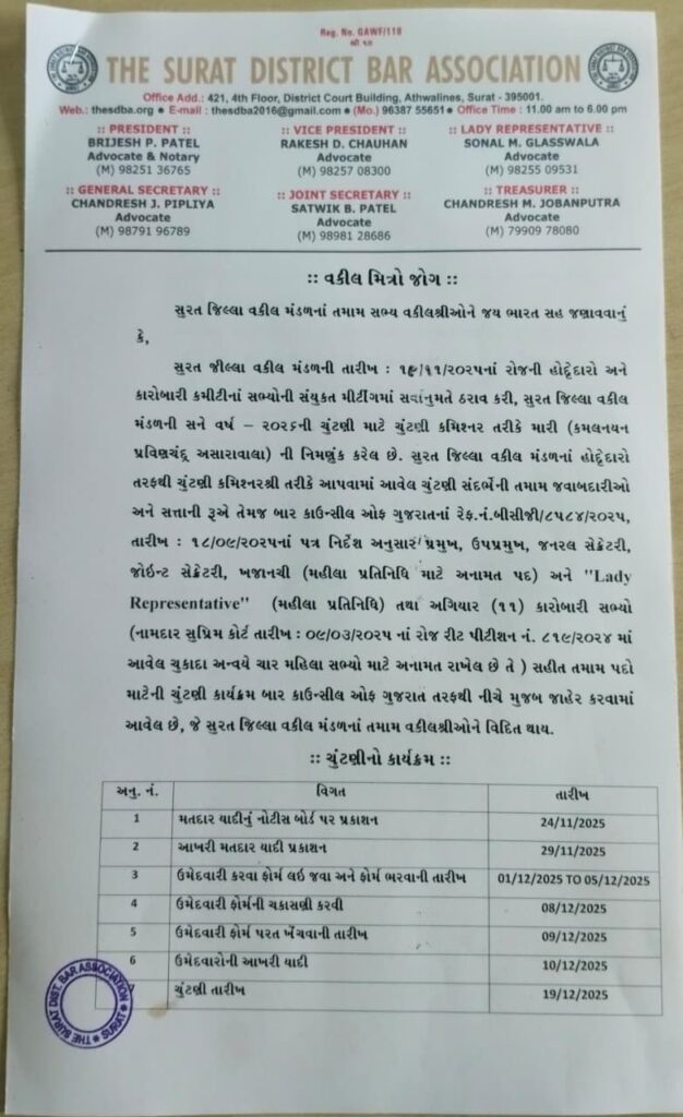 સુરત જિલ્લા વકીલ મંડળની 2026 ની ચૂંટણી કાર્યક્રમની સત્તાવાર જાહેરાત